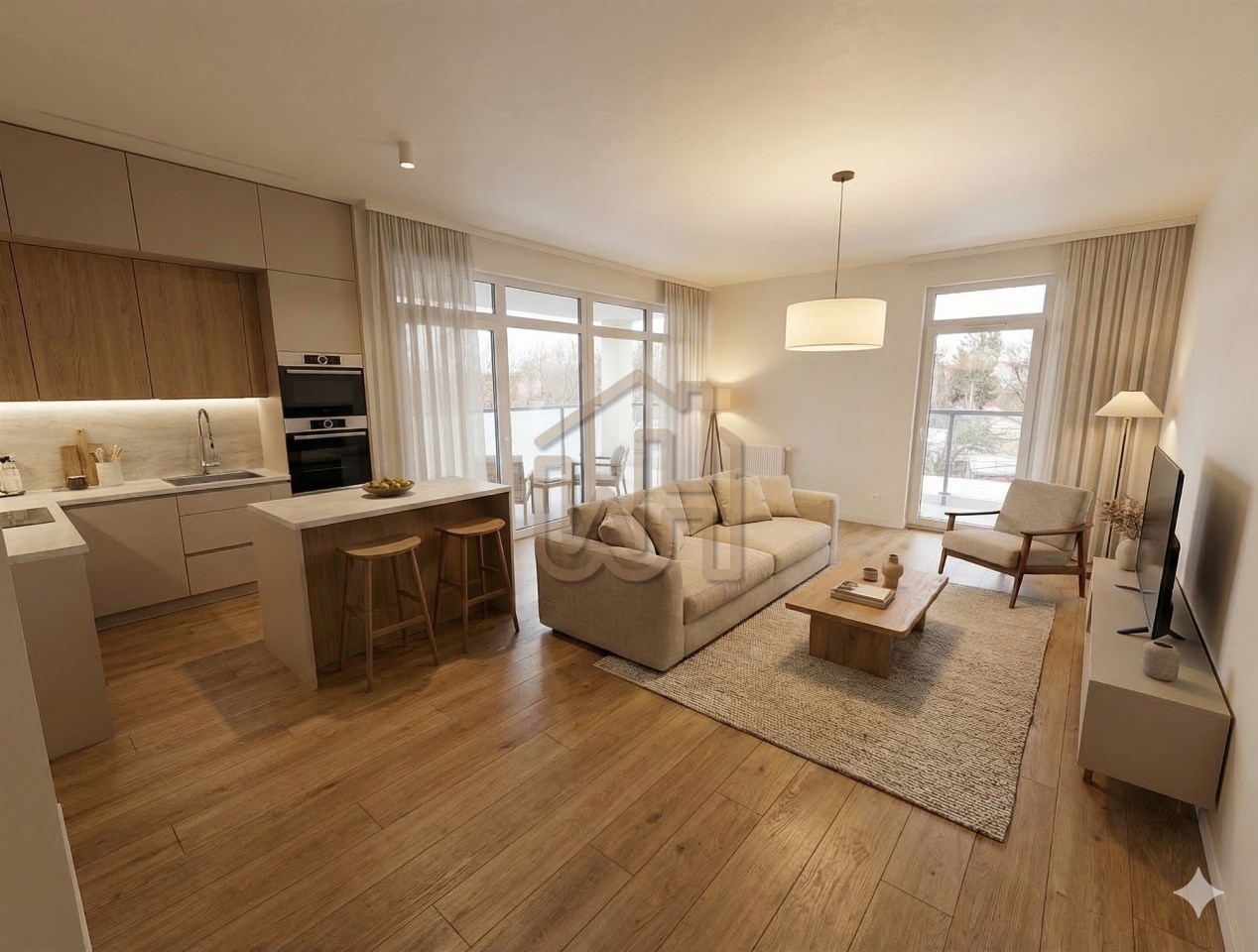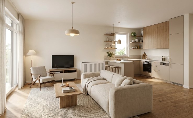 Przestronny salon z widną kuchnią (23 m2) tworzący otwartą przestrzeń do życia.